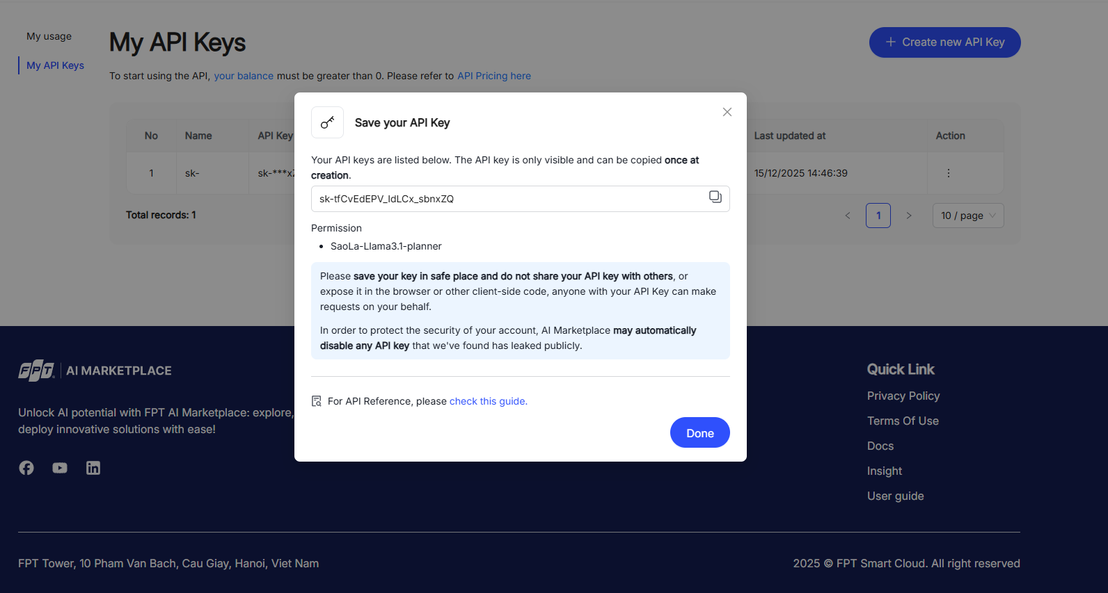 Please log in and navigate to https://marketplace.fptcloud.com/en/my-account#my-api-key