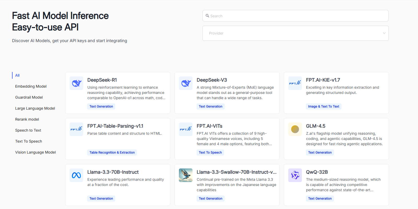 Figure 1: List of available models on FPT AI Marketplace