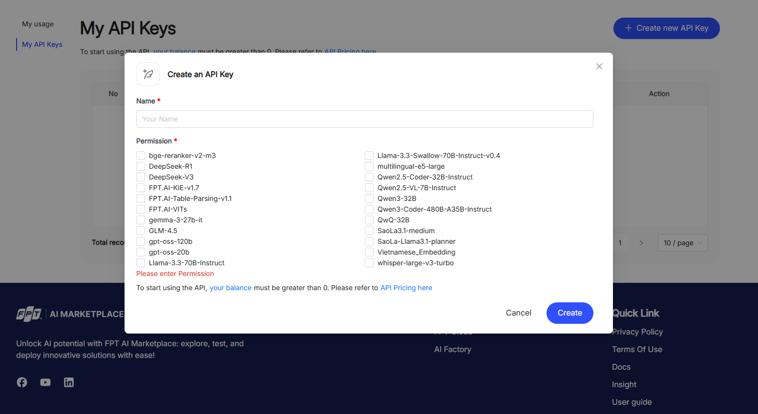 Click “Create new API Key”, select the desired models, enter a name for your API key, and then click “Create”.